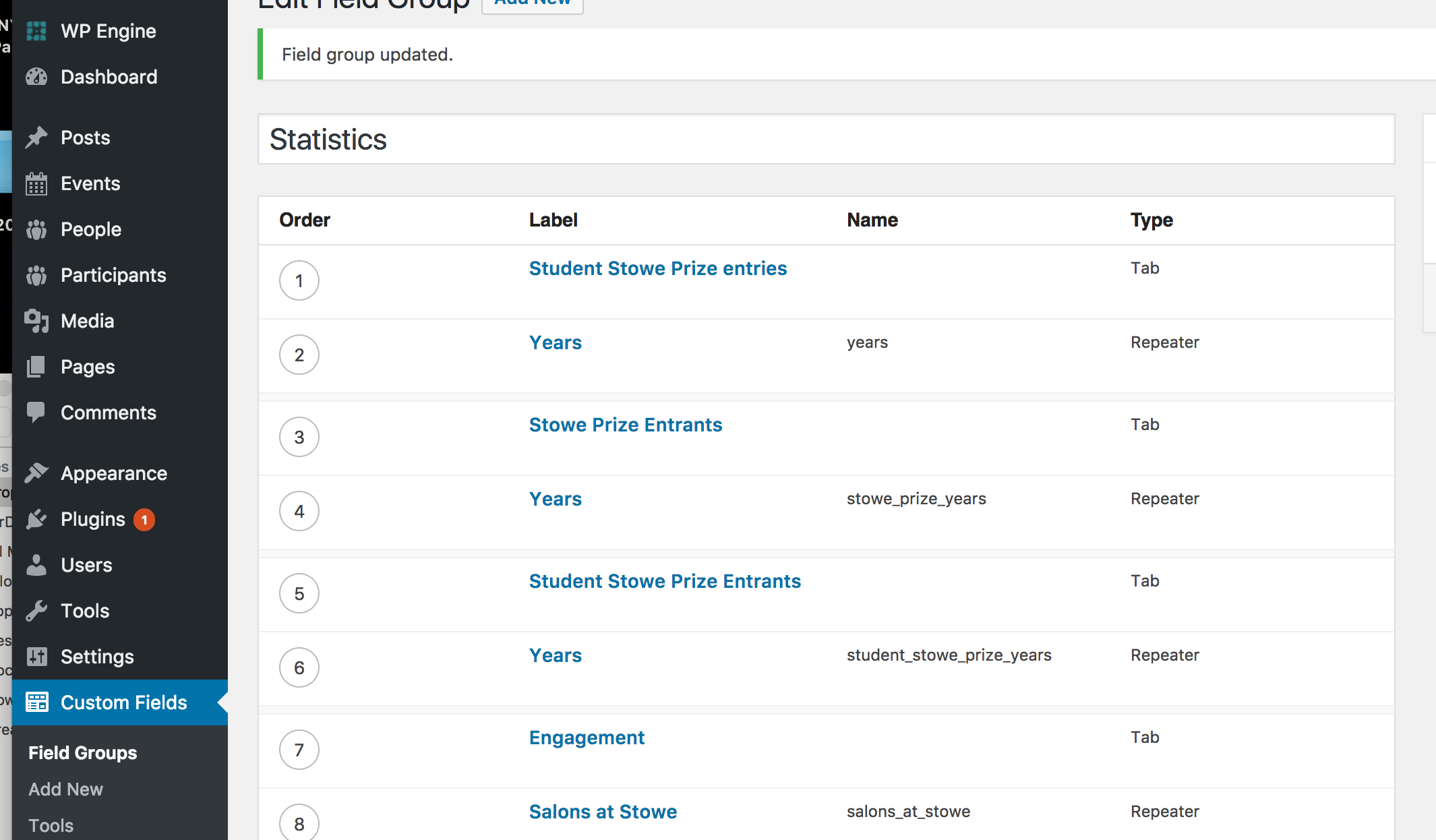 For the Stowe Center Impact & Issues statistics, it seems that we can edit the fields and field names under Custom Fields > Field Groups, but when I changed Educational Age Groups to Student Stowe Prize Entries nothing changed on the front-end. Can you advise?