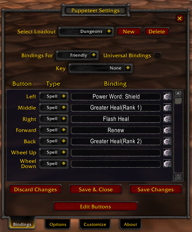 Puppeteer boasts the ability to bind mouse clicks, the mouse wheel, and keys to any combination of Shift/Ctrl/Alt modifiers. You can bind spells, macros, items, custom Lua scripts, and menus which contain multiple bindings. Use the /pt command to open the configuration menu.