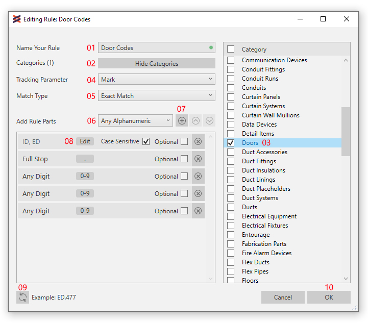 - You need to select which category (or categories) of elements this rule should be applied to. In our case, door codes only need to apply to doors. Click the Show Categories button (2)