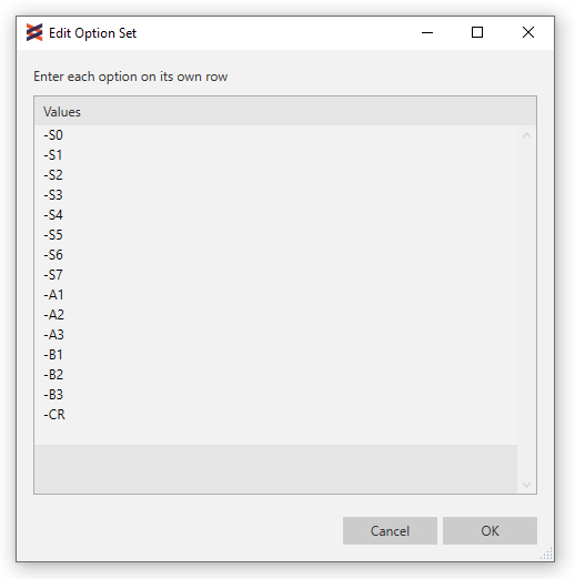 - This launches the Option Set Editor. Add new options by typing values in new rows of the editor. In this instance, type 'ID' on a single line, and 'ED' on another line. You can now close the Option Set Editor, and the rule-part will have updated to show your newly-added options. We can also set whether a rule part is case-sensitive, or might appear optionally inside the rule part body.