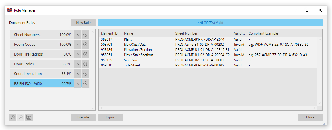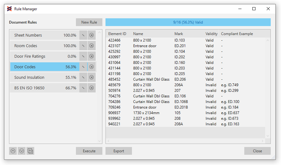 The rule is now specified! We can execute the rule from the Rule Manager to validate all our doors, walls and windows against this format. To execute the rule, simply select it and click the Execute button. The Rule Manager will expand to create a new report.