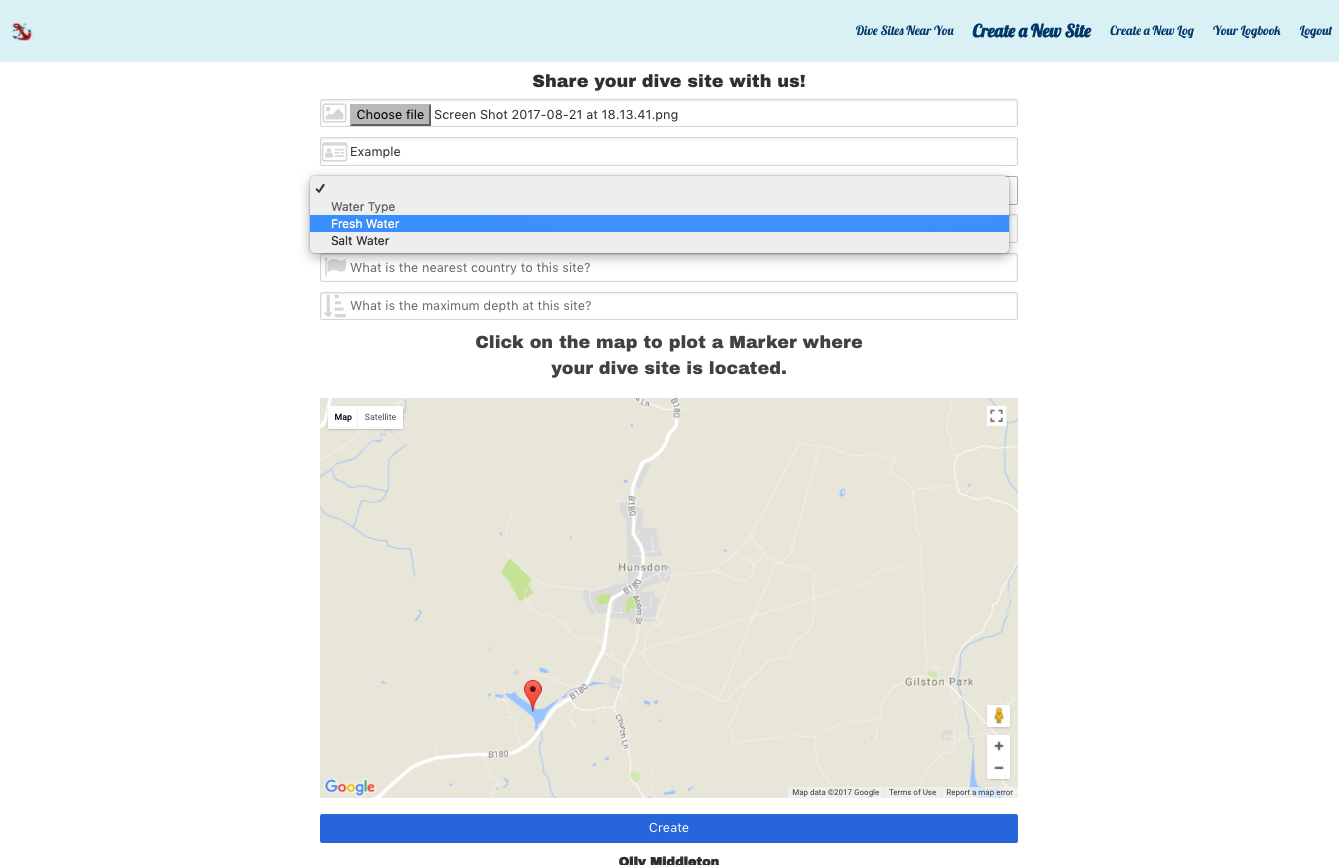 The user uses the maps API and the form to create a new dive site for the bubbles community to view and potentially dive on. If the original poster feels that the marker is inaccurate they go back in and drag the marker to position to its new position