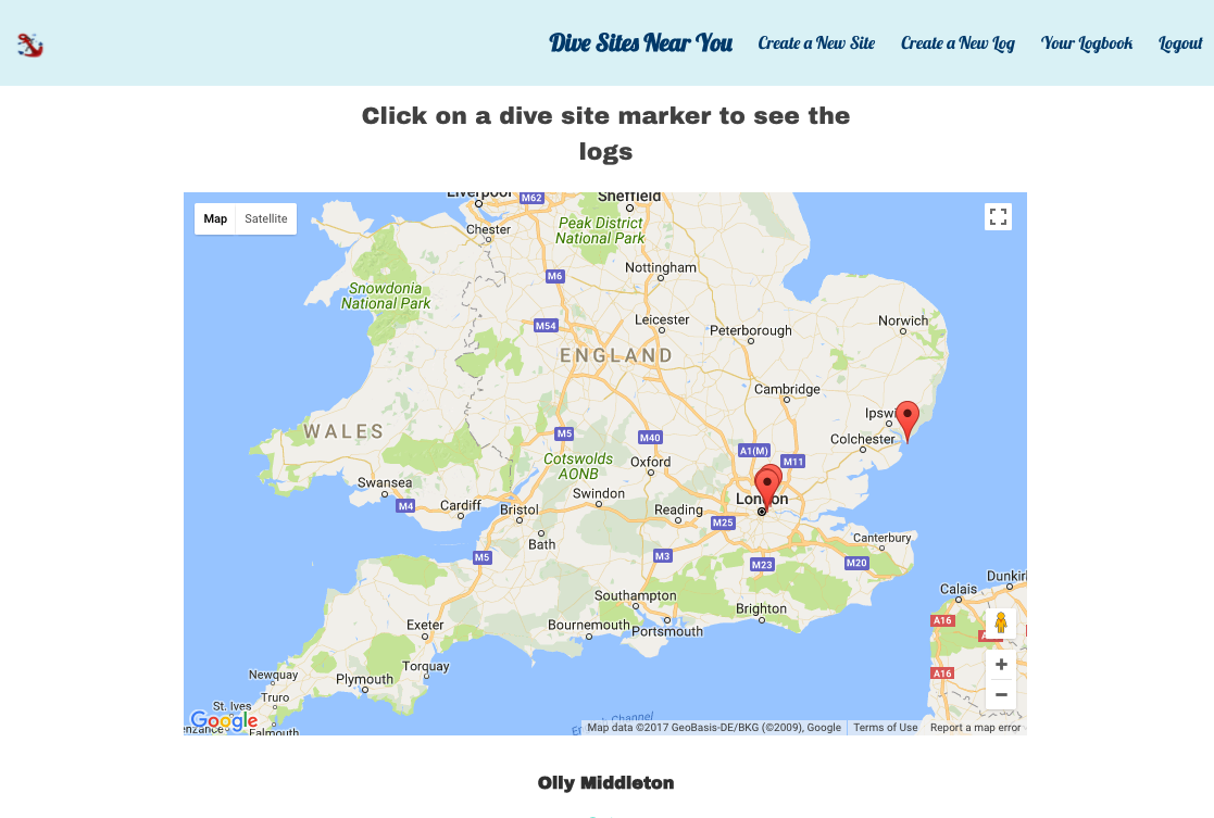 To view dive sites, the viewer can click on any one of the multitude of markers on the dive site index page that represent dive sites recorded by other users. Each Dive site will show the details of the site and also all the logs of people who have dived on that site