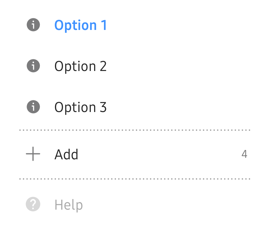 app:counterEnabled="..." />app:icon="..." attribute is the button icon, and app:text="..." the text. app:selected="..." is to show the OptionButton as selected (colored and bold text), it's false by default. app:counterEnabled="..." and app:counter="..." can customize a counter at the end of the view, which is disabled by default. Make sure to enable the app:counterEnabled attribute or it won't show up.