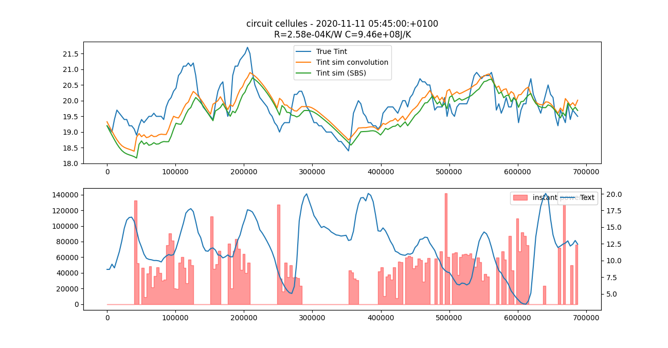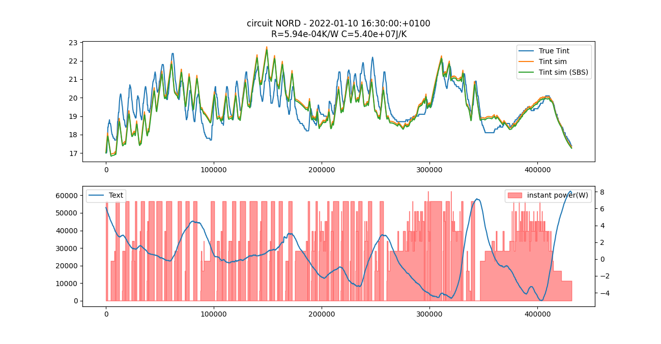 On a retenu pour le simulateur l'utilisation d'un modèle R1C1 car il est peu compliqué à mettre en œuvre et assez bien représentatif du comportement thermique d'un bâtiment. En matière de vérité terrain et pour procéder à des optimisations, il nécessite des données facilement disponibles avec les technologies actuelles : températures intérieure et exterieure, puissance instantanée de chauffage.