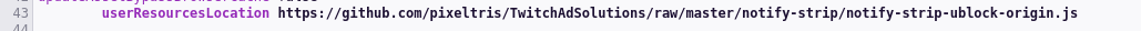 userResourcesLocation https://github.com/pixeltris/TwitchAdSolutions/raw/master/notify-strip/notify-strip-ublock-origin.js