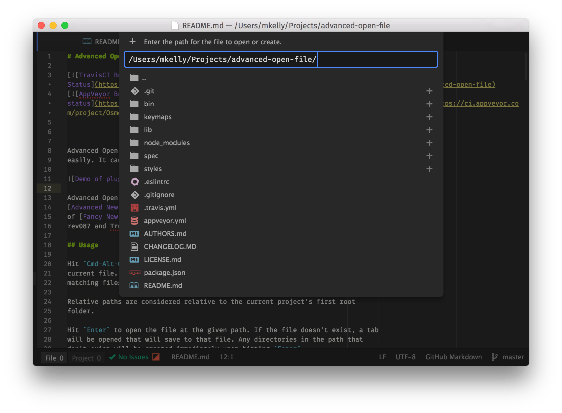 $ apm develop advanced-open-file /path/to/checkoutThe command above will use Git to clone Advanced Open File to the