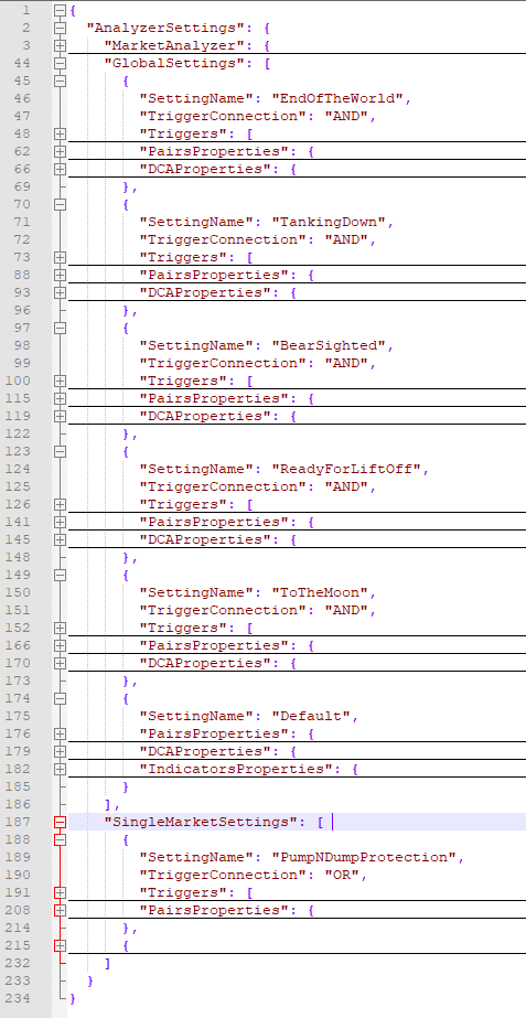 As you can see there are several sections of lines building a property block. There are 2 blocks from (line 8-21) for market trends. Line 7 has the label "MarketTrends" in it and the list of the following market trend blocks is surrounded by 2 brackets "[" and "]". So this type of brackets mark the beginning and the end of a list. It is important that each opening bracket (line 7) has to have a matching closing bracket (line 22). Another list starts at line 24 ("GlobalSettings") but its closing bracket is outside of this example image.