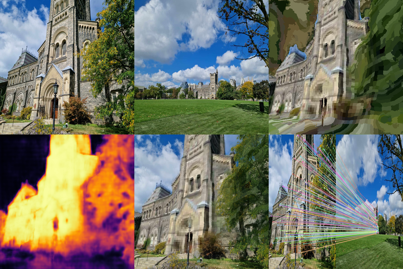 Top-left: Image A · Top-center: Image B · Top-right: Image B warped into A's frame