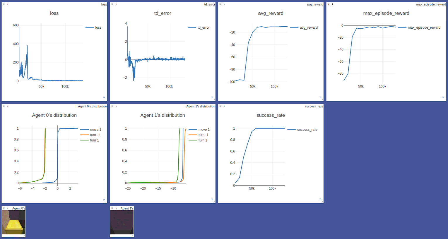 - While visualization can help debugging and provide a better understanding of the agent, it has a large (negative) impact on the run time.