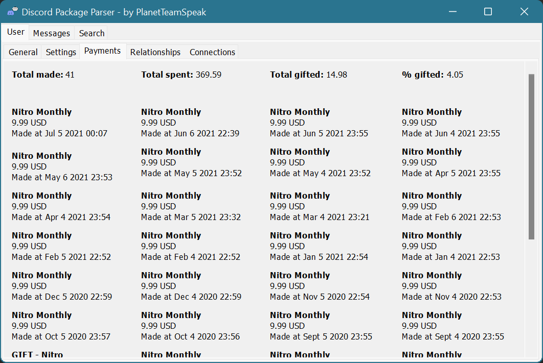Any payments ever made to Discord, most likely Nitro or Nitro gifts, are located here. It also shows you how much money you have spent on Discord in total and how much of that was gifted to others.