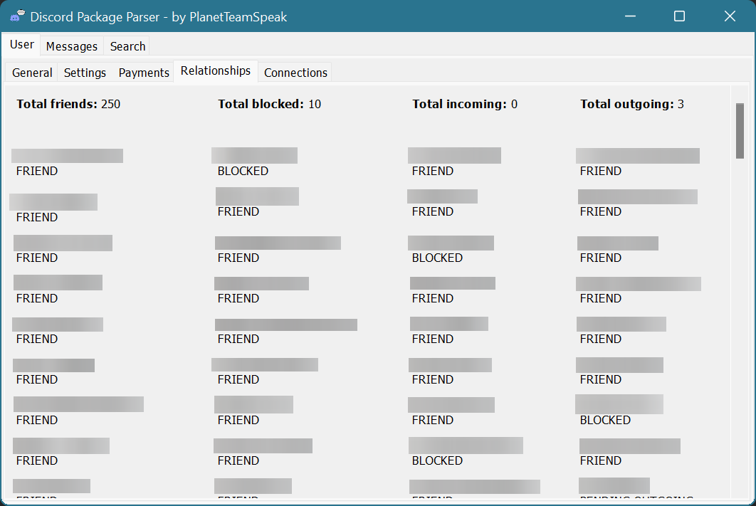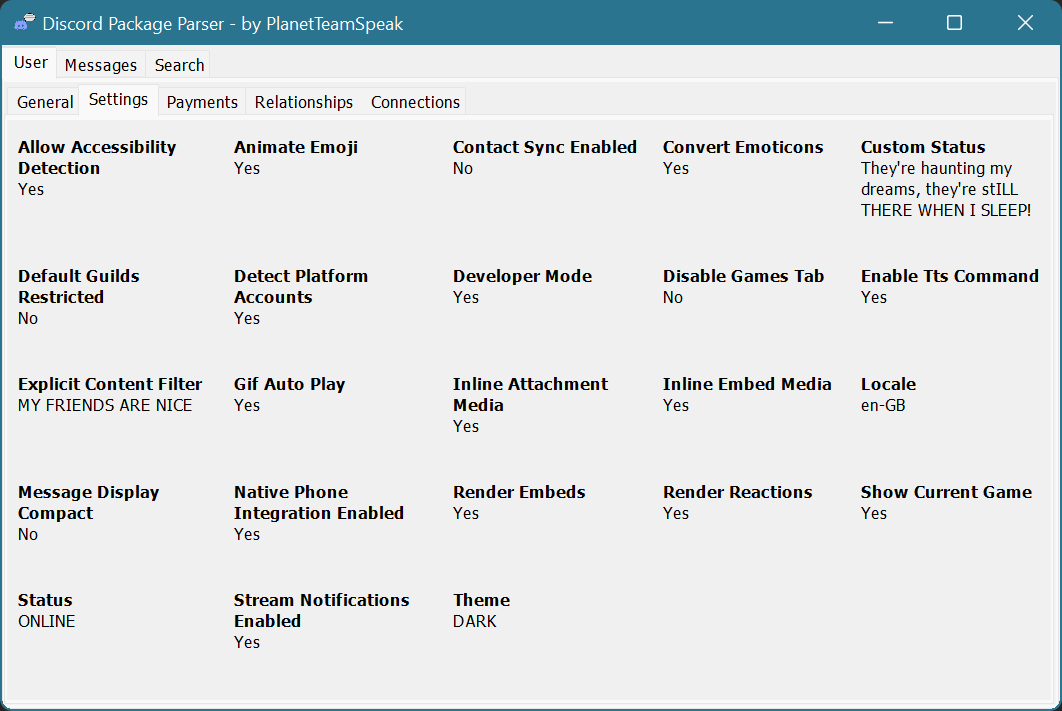 With this tool you can parse the personal data packages Discord sends you upon request, it shows everything from general information, to all messages you ever sent to all your friends and other relations, a great way to thoroughly get to know what Discord has on you.