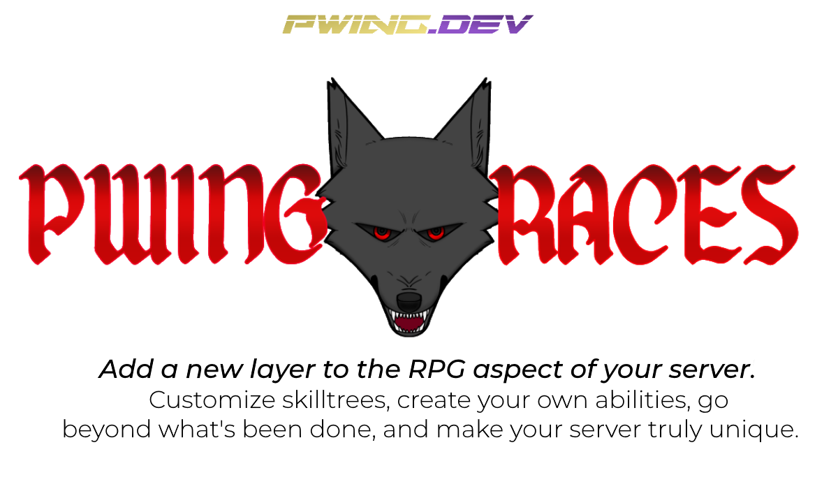 PwingRaces was designed with customization in mind, but also in a way that allows you to take it to it's potential while not being too complex. Races in this plugin aren't hardcoded whatsoever, allowing you to make whatever race you please. While it comes with a couple races out of the box, you are free to create, customize and design your own races however you please.