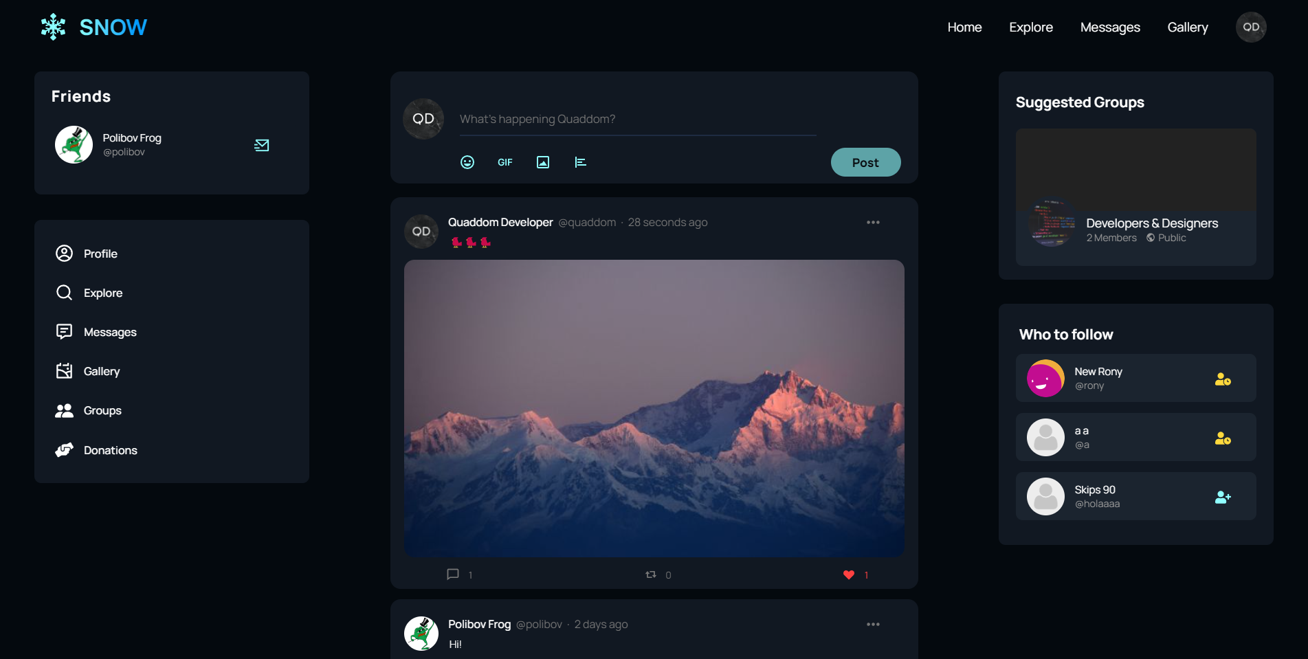Snow is a social network developed by me, it all started as a small social network project, but I decided to take it to another level, so Snow was born. Here you can upload posts, polls and images in your own gallery, it has a real-time chat, emojis, gif search, news, groups and much more!
