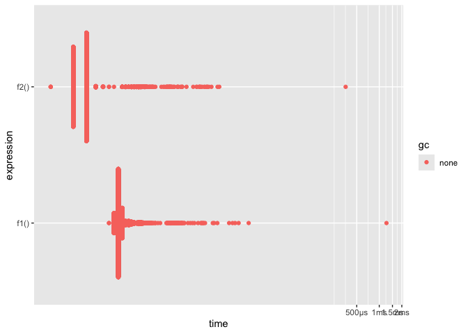 #> 2 f2() 41ns 123ns 5988817. 0B 0 10000 0 1.67ms