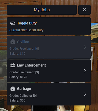 randol_multijob A multi job script for QBCore/QBox using ox_lib QBOX BRANCH HERE: https://github.com/Randolio/randol_multijob/tree/qbox Default keybind to open is F10 or use command /myjobs