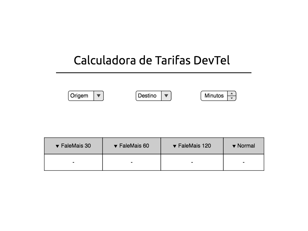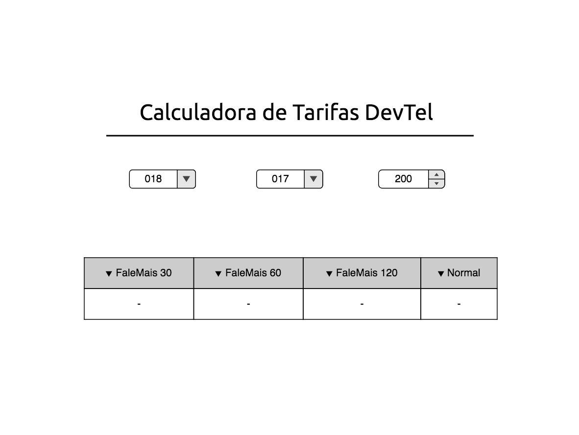 A DevTel quer uma ferramenta onde o cliente possa calcular o valor da ligação. O cliente deve escolher os códigos das cidades de origem e destino e informar o tempo da ligação em minutos. Será apresentado para ele uma tabela comparando os planos FaleMais bem como sem plano algum. Não existe custo inicial para a aquisição do plano.