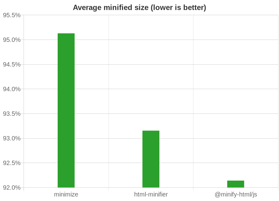 Comparison with html-minfier and minimize, run on the top web pages. See the breakdown here.