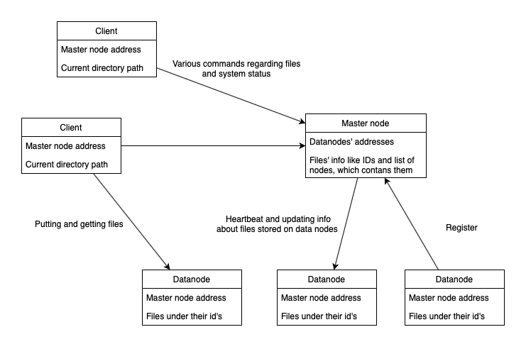 Firstly, both Master Node and Data Nodes pinged each other asking for different information. But then we found that Data Nodes do not need to ping Master. Master can periodically ask Data Nodes to check that they have all tracked files, ask if they received any new untracked files, etc. If Data Nodes do not have something they should or do not respond they are dropped.