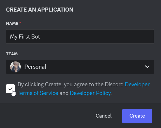 - Agree to Discord Developer Terms of Service and Developer Policy
