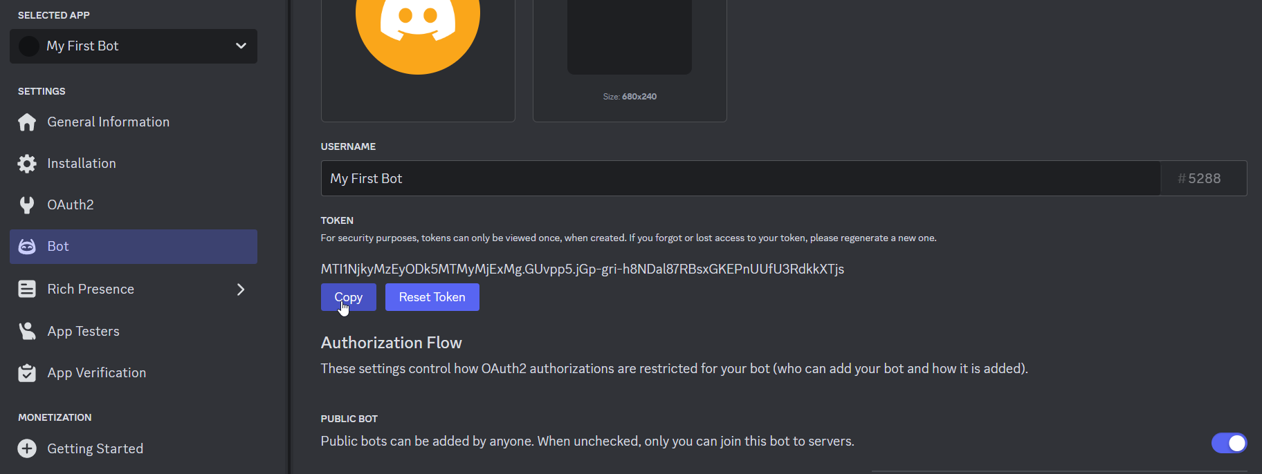 - In the "Bot" tab, click "Copy" under "TOKEN". Save this token as it will be used in your code.