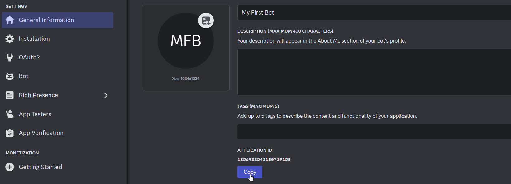 - In the "General Information" tab, click "Copy" under "Application ID". Save this ID as it will be used in your code.