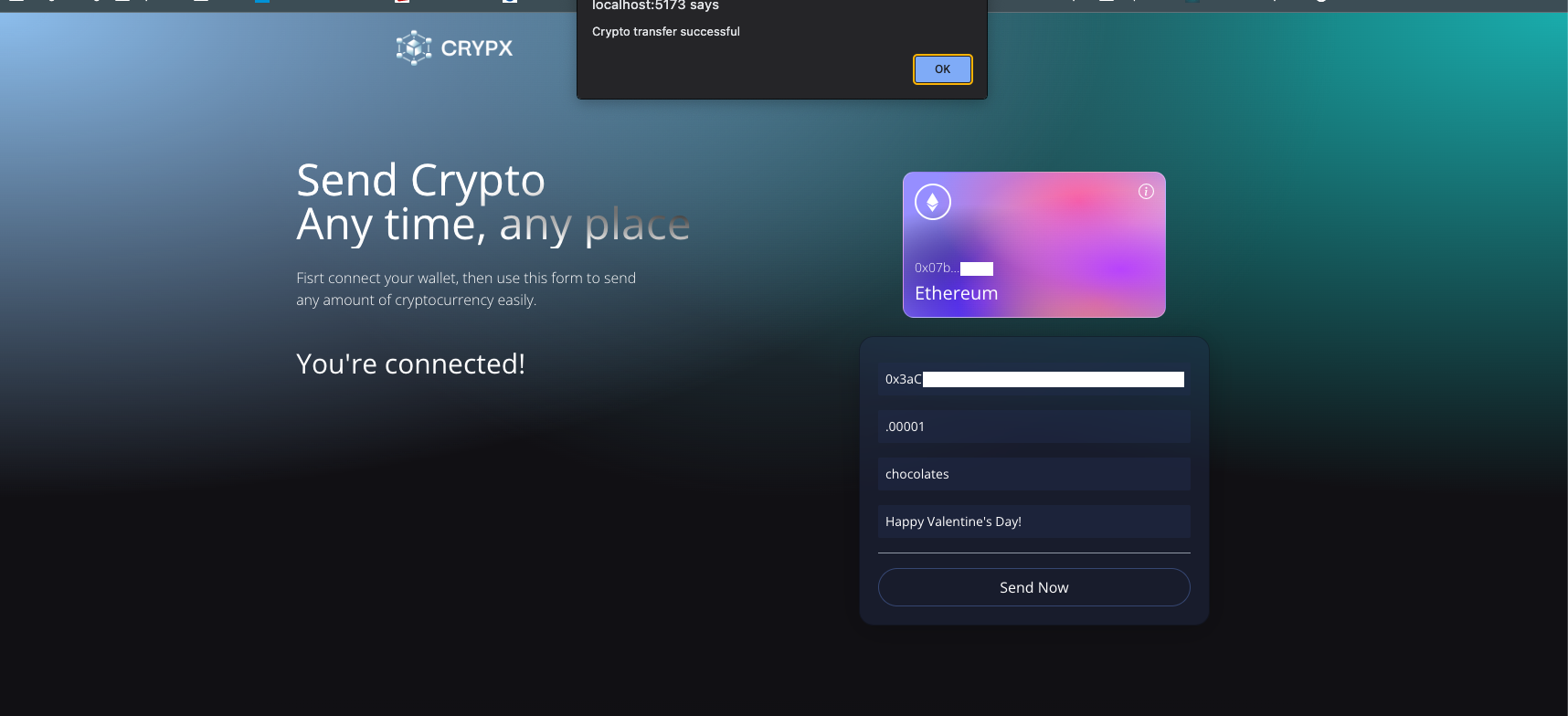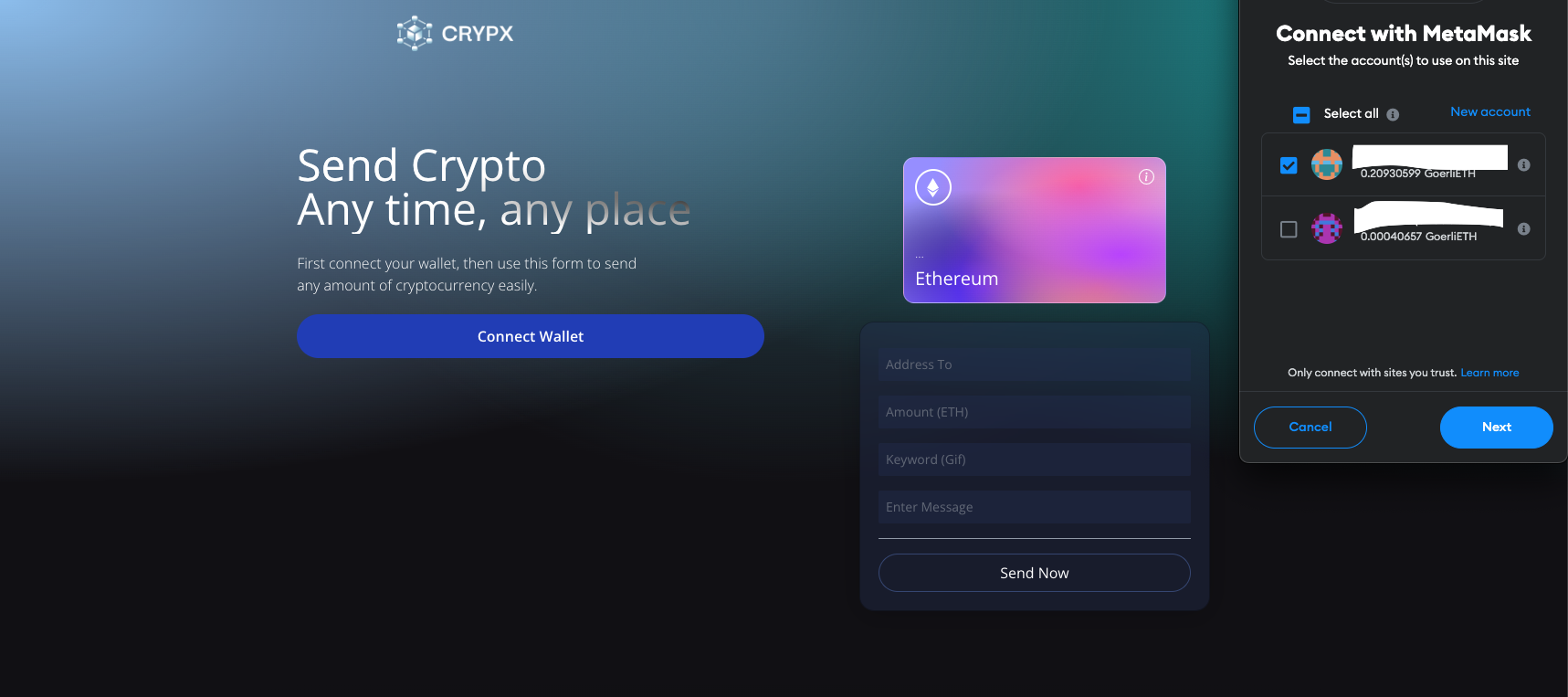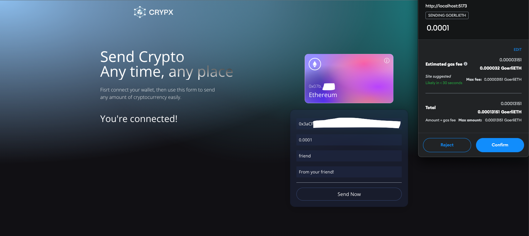 I created this project to get a better understanding of emerging technologies being used in the blockchain/crypto sphere. In this guide I'll walk you through the flow of the app. If you follow along with the content of this readme (it's quite short), you'll be able to send GoerliETH test currency through the Ethereum network. Please pick up some GoerliETH through this faucet, and download the Metamask wallet before continuing.