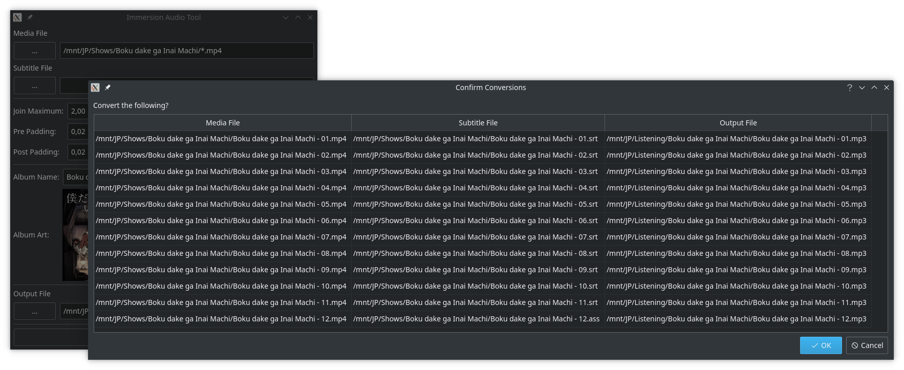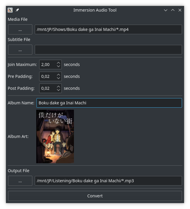 - Album Name/Art setthose properties of the generated output files (optional, only works with mp3 currently)