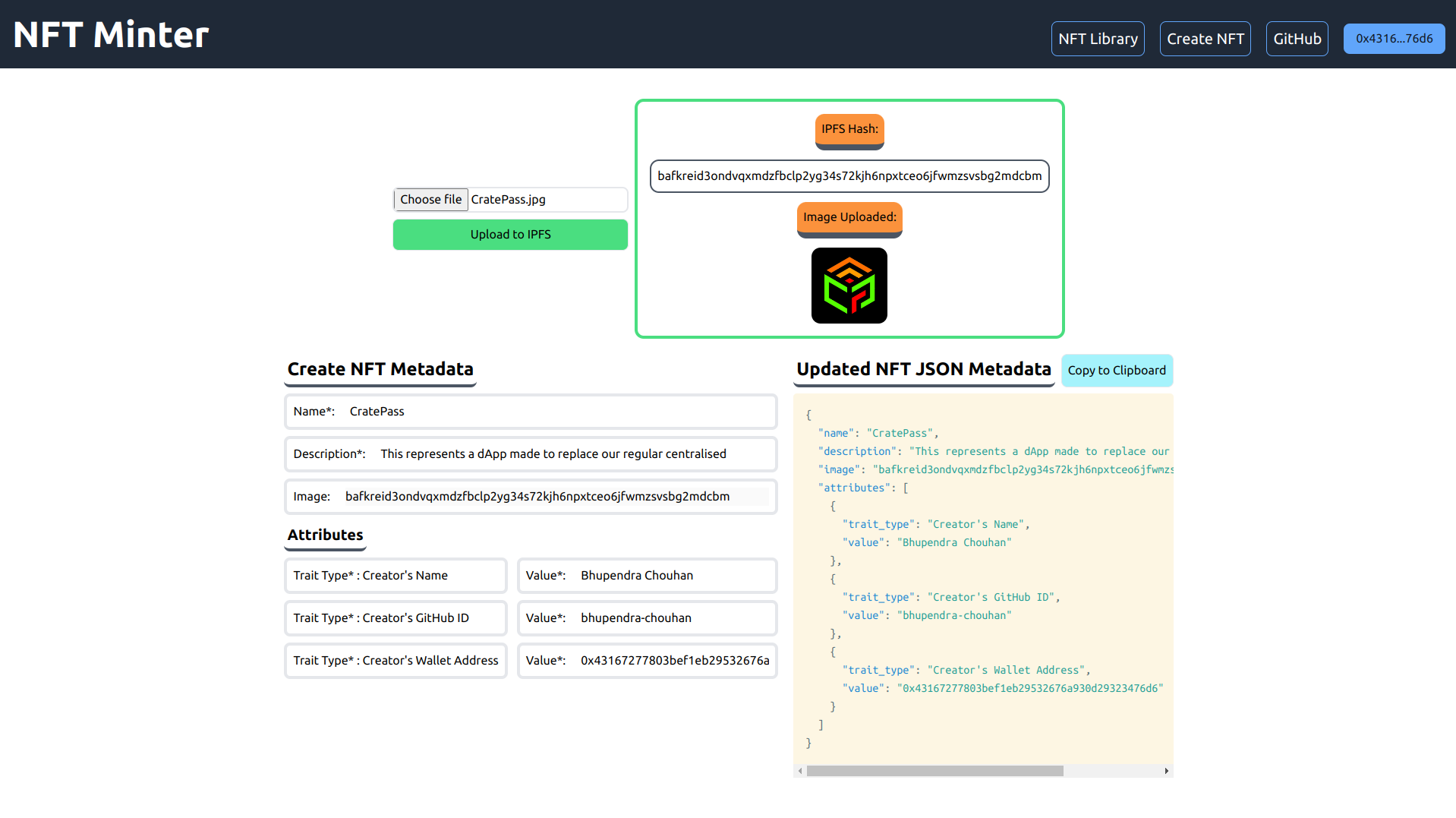 The NFT-Minter Project is an open-source, blockchain-based application designed to simplify the NFT creation process. It allows users to upload their NFT images, generate JSON metadata for the NFT, and interact with a dynamic NFT marketplace. Beginners can contribute to the project while learning how to develop decentralized applications (dApps). By offering easy integration with blockchain technology, the project aims to empower users to engage in the world of NFTs, regardless of technical expertise.