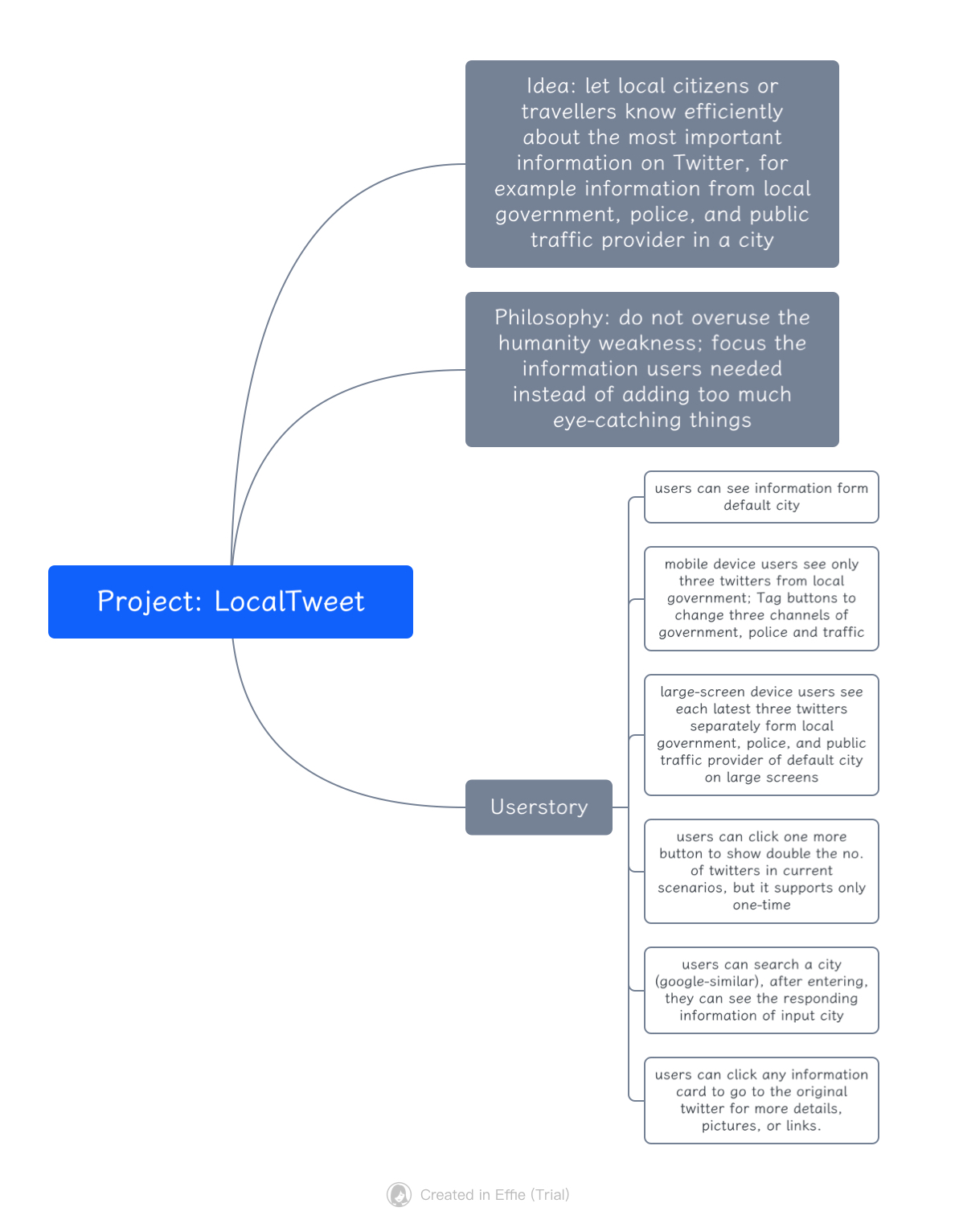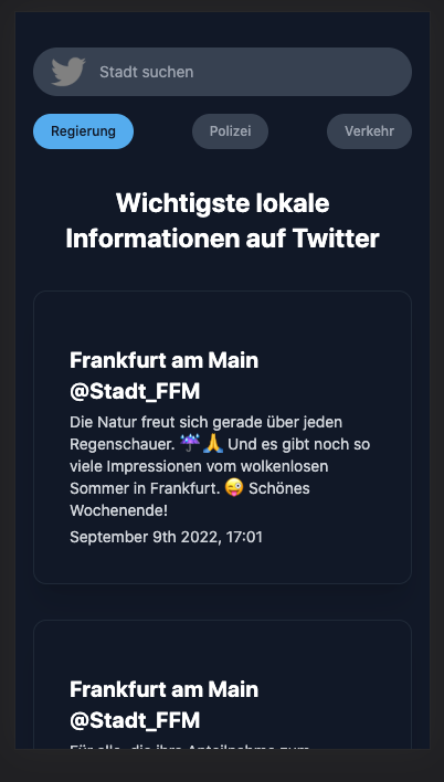 - Idea: let local citizens or travellers know efficiently about the most important information on Twitter, for example information from local government, police, and public traffic provider in a city
