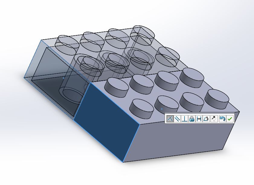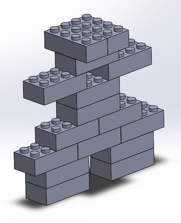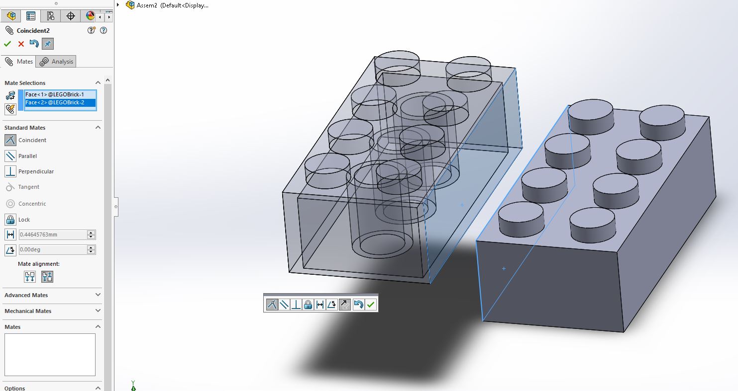 There are a few different types of mates you can use as well, have a go at using the cylindrical mate, it works by aligning cylindrical shapes in line with each other, perfect for mating the tops of the bricks on top of each other.