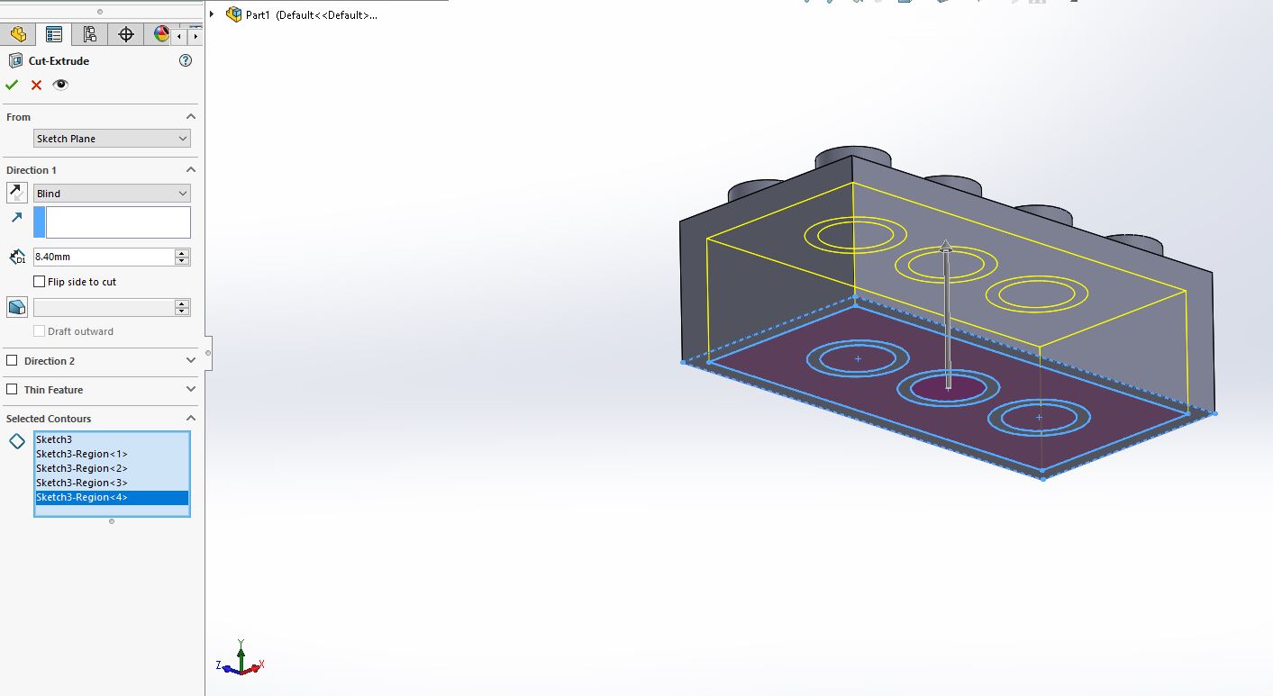 With everything in place, we can exit the sketch and start the subtraction. For this part we'll be using the "Extruded Cut" tool, think of it as the opposite of the Extruded Boss/Base tool, anything highlighted will be cut out of the model.