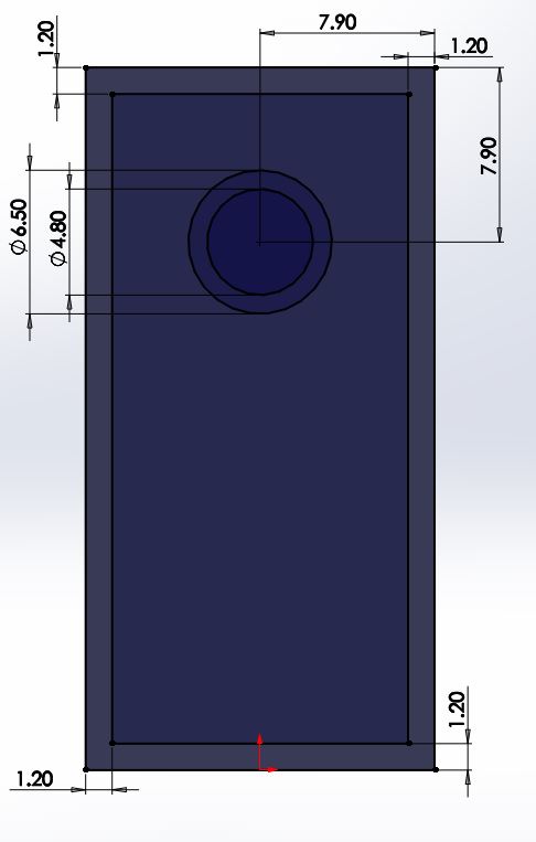 From here we need to create the circles inside the rectangle. Using the Centre Circle tool create two circles with the same centre point. Again using the Smart Dimensions tool make the smaller circle have a diameter of 4.8mm and the larger one of 6.5mm. We can also make sure they are placed where we want it by measuring the centre distance from the edges of the outside rectangle. For the distance the circles should be 7.9mm from all the edges.