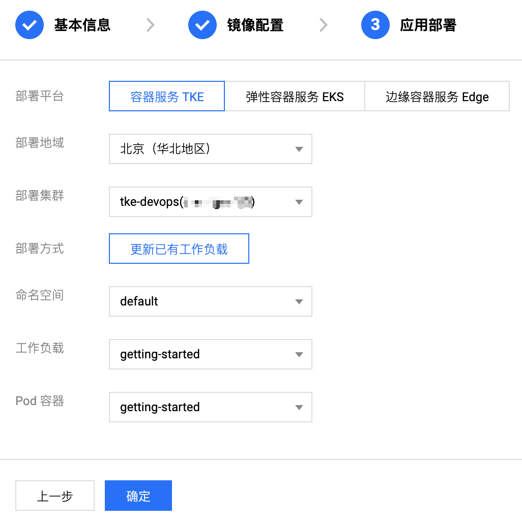 - 部署集群:目标集群。选择已创建的 TKE 标准集群。