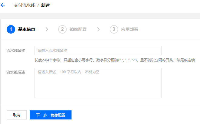 - 流水线名称:交付流水线名称,长度2-64个字符,只能包含小写字母、数字及分隔符(".", "_", "-"),且不能以分隔符开头、结尾或连续。
