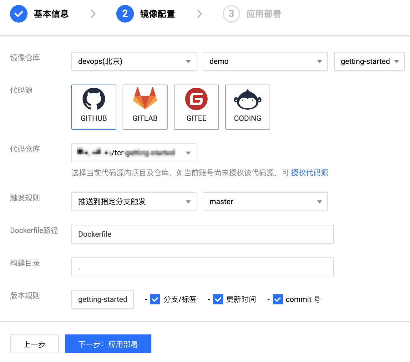 - 镜像仓库:交付流水线关联的镜像仓库,将自动配置镜像构建及推送,用于托管应用部署所需要的镜像,本文以 demo/getting-started 仓库为例。