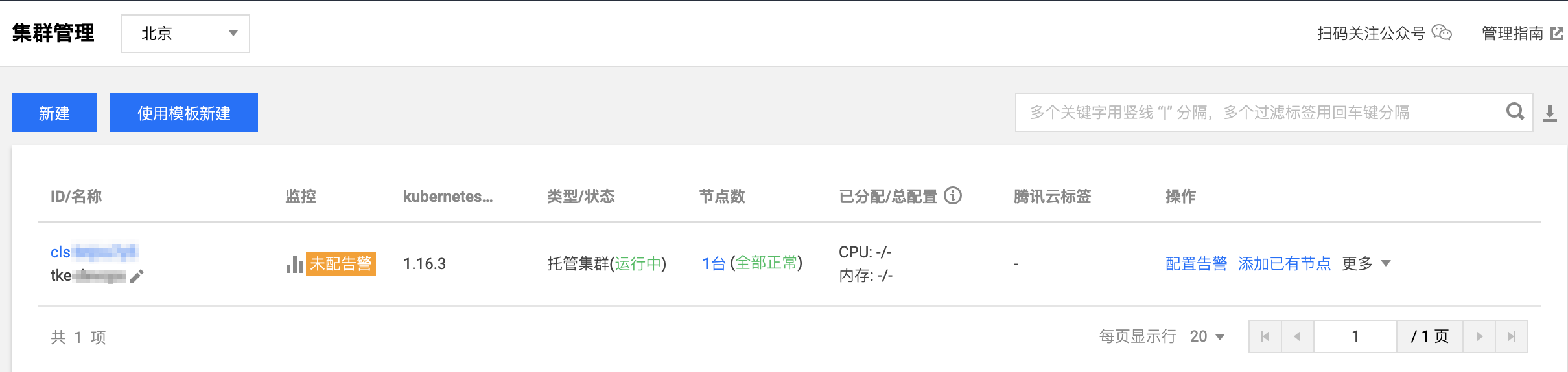 前往 容器服务控制台,新建 TKE 标准集群,详情请参见 创建集群。创建成功即如下图所示: