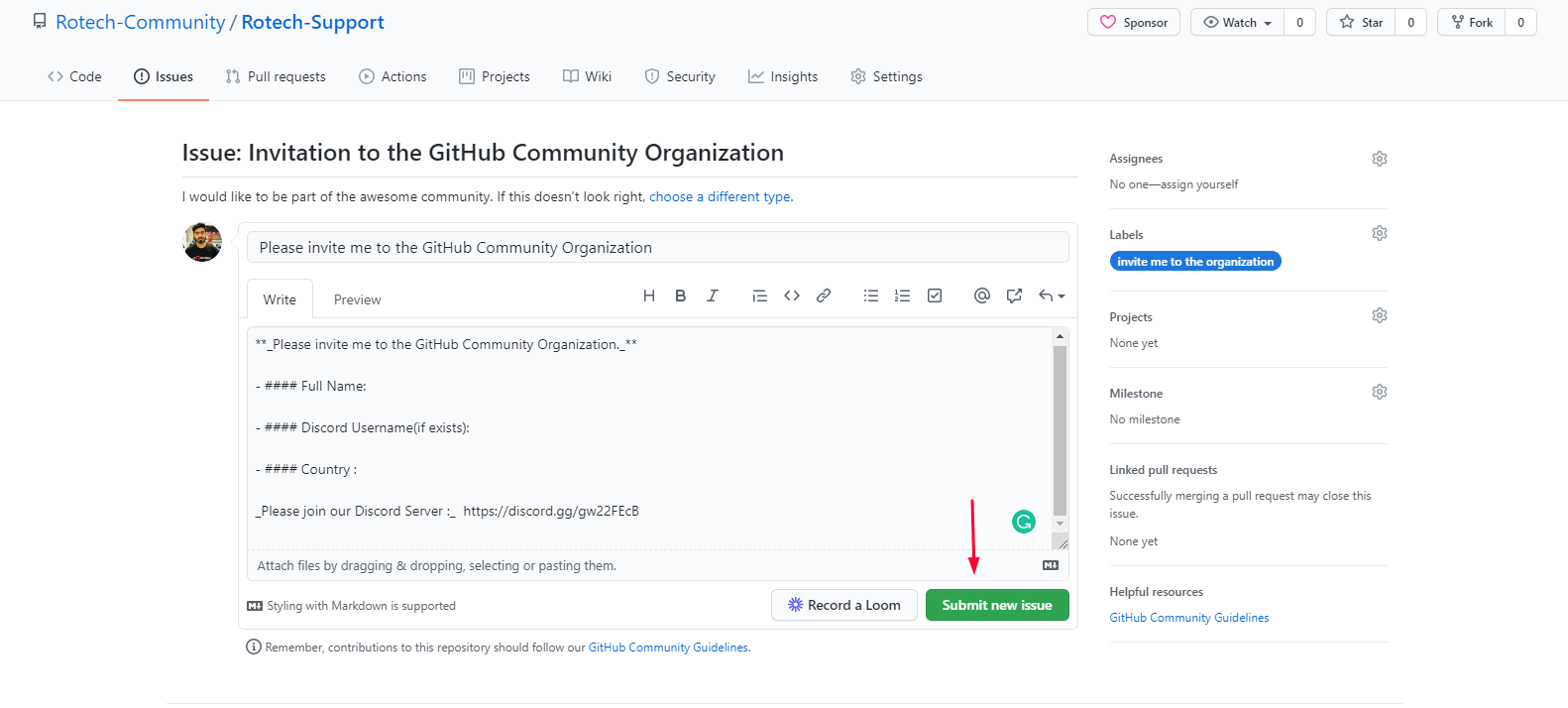 Enter your Name , Discord Username & Country to get an Invitation . Dont worry All of these details are optional for you . Please do not change the Labels.