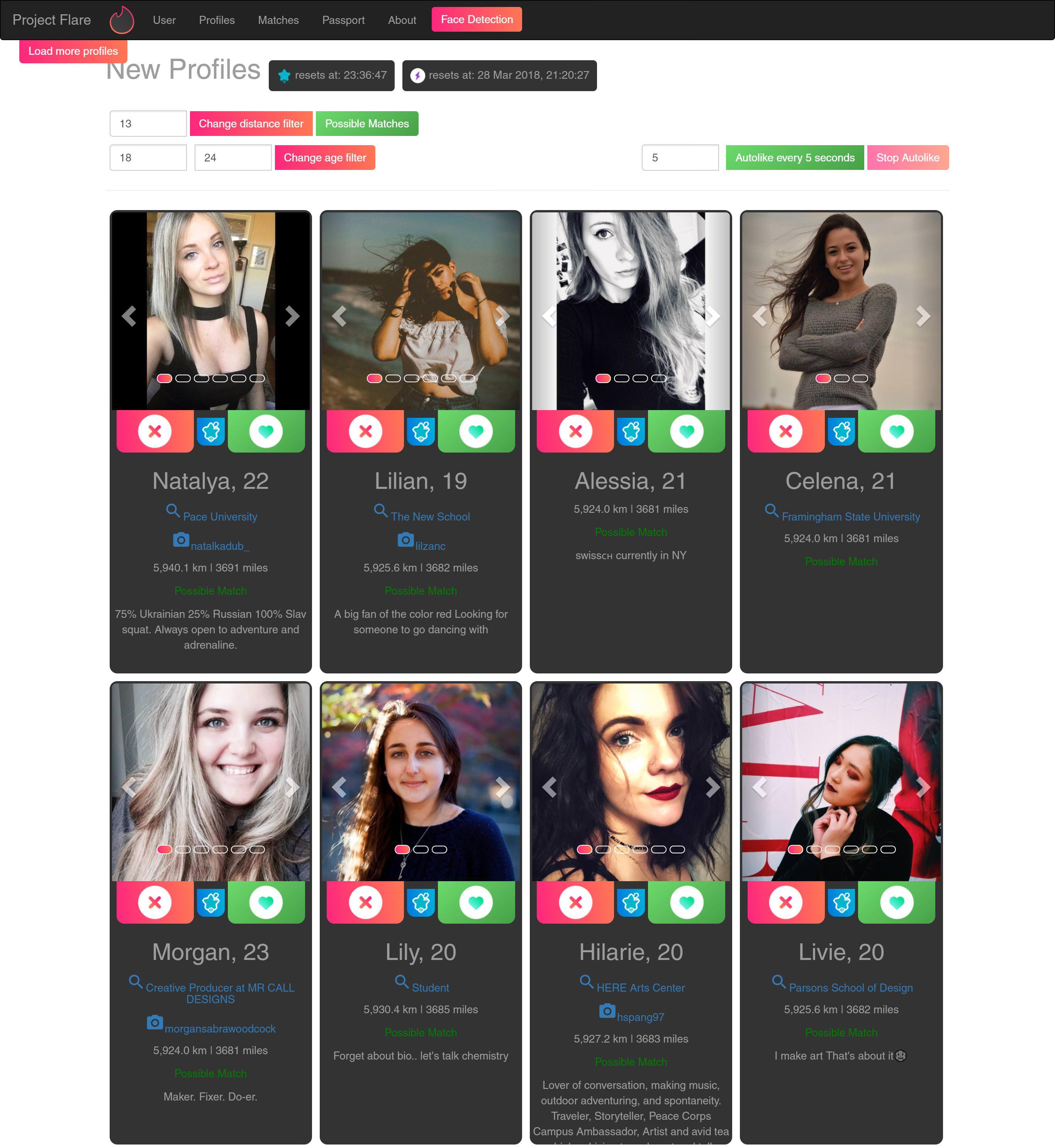 Project Flare is a full-fledged Tinder web client made in Angular with extra features such as the ability to see profile picture success rate (If Smart Photos is enabled), see possible matches, search profile on Facebook/Instagram, change location without Tinder plus, see a person's approximate location, an input for images to detect specific face attributes and emotions such as age, gender, happiness, etc...