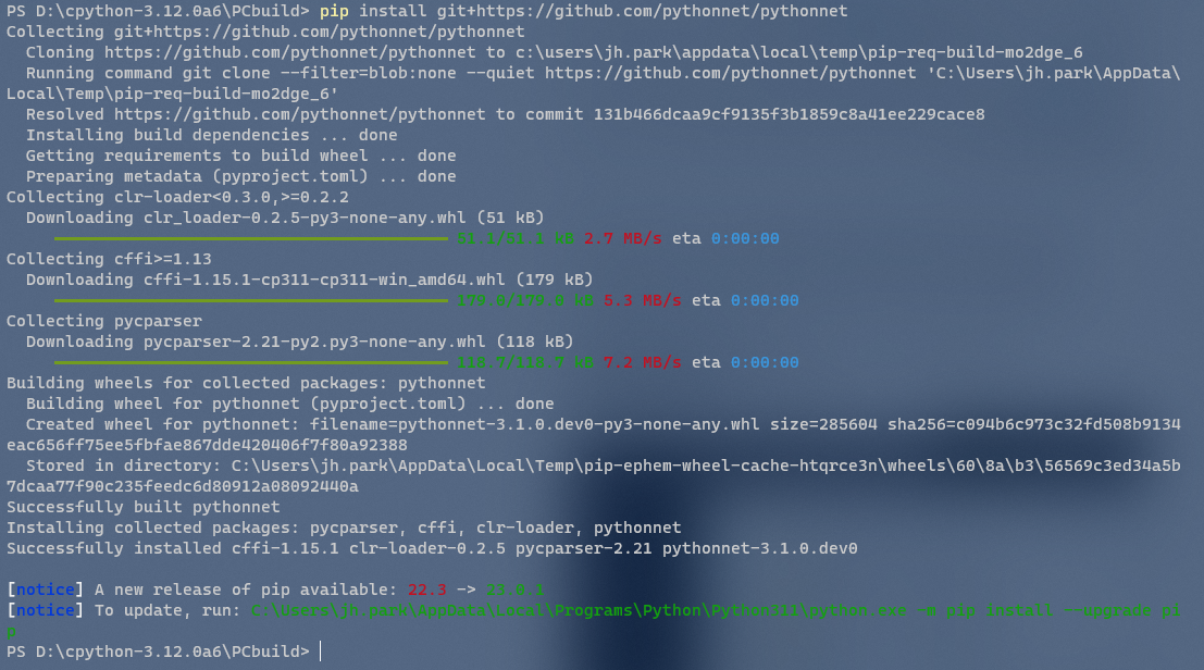- 다음 명령어를 입력하여 Python for .NET을 설치