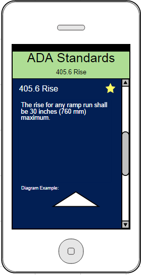 From the browse page, or if the selection has been favorited by the user, from the favorites screen, a user can bring up a particular standard. This screen shows an example standard for ramp rise height limits and an example of what a diagram may look like. From this page a user may favorite (or unfavorite) a selection. Once favorited, the standard will saved to the users list.