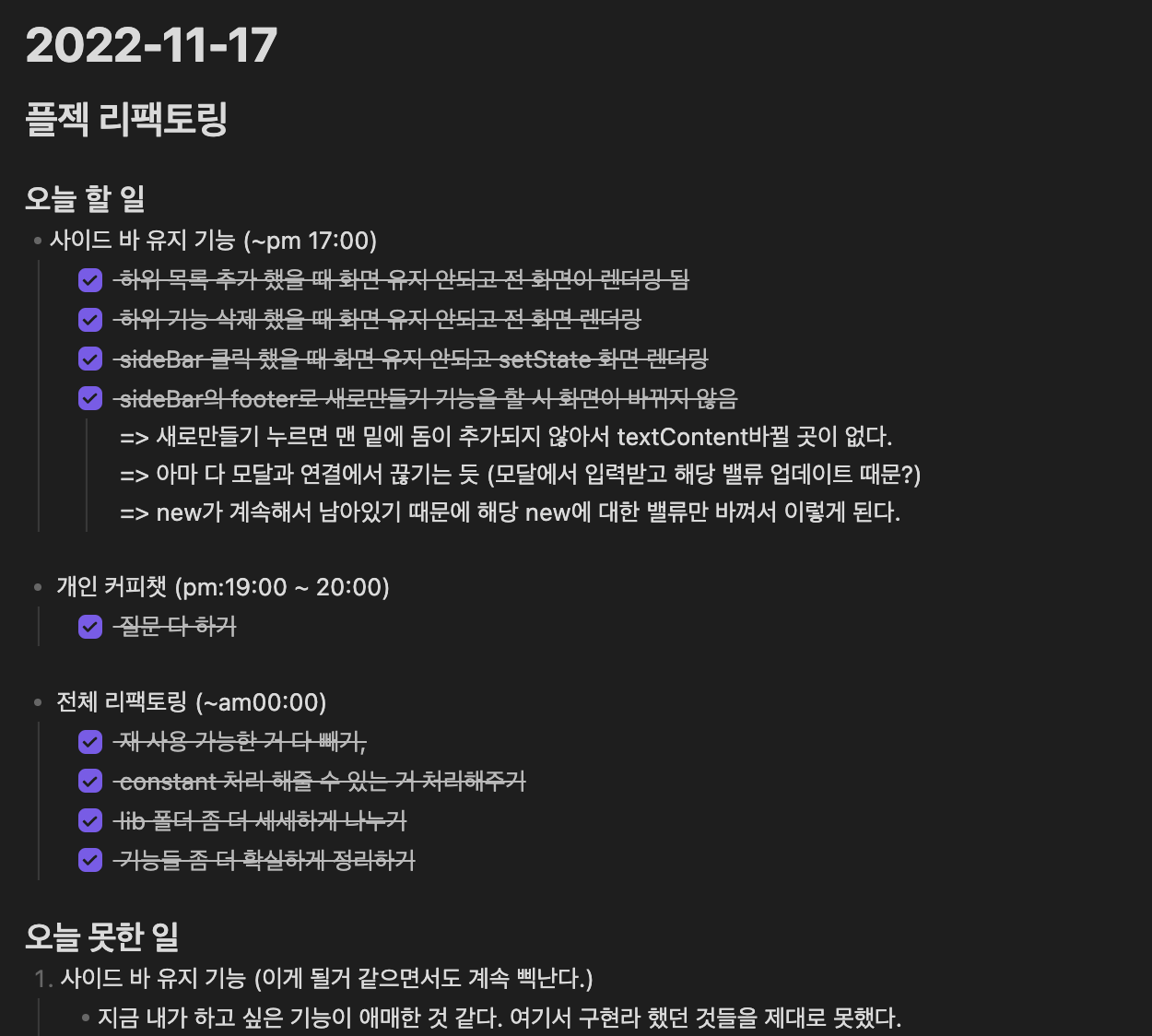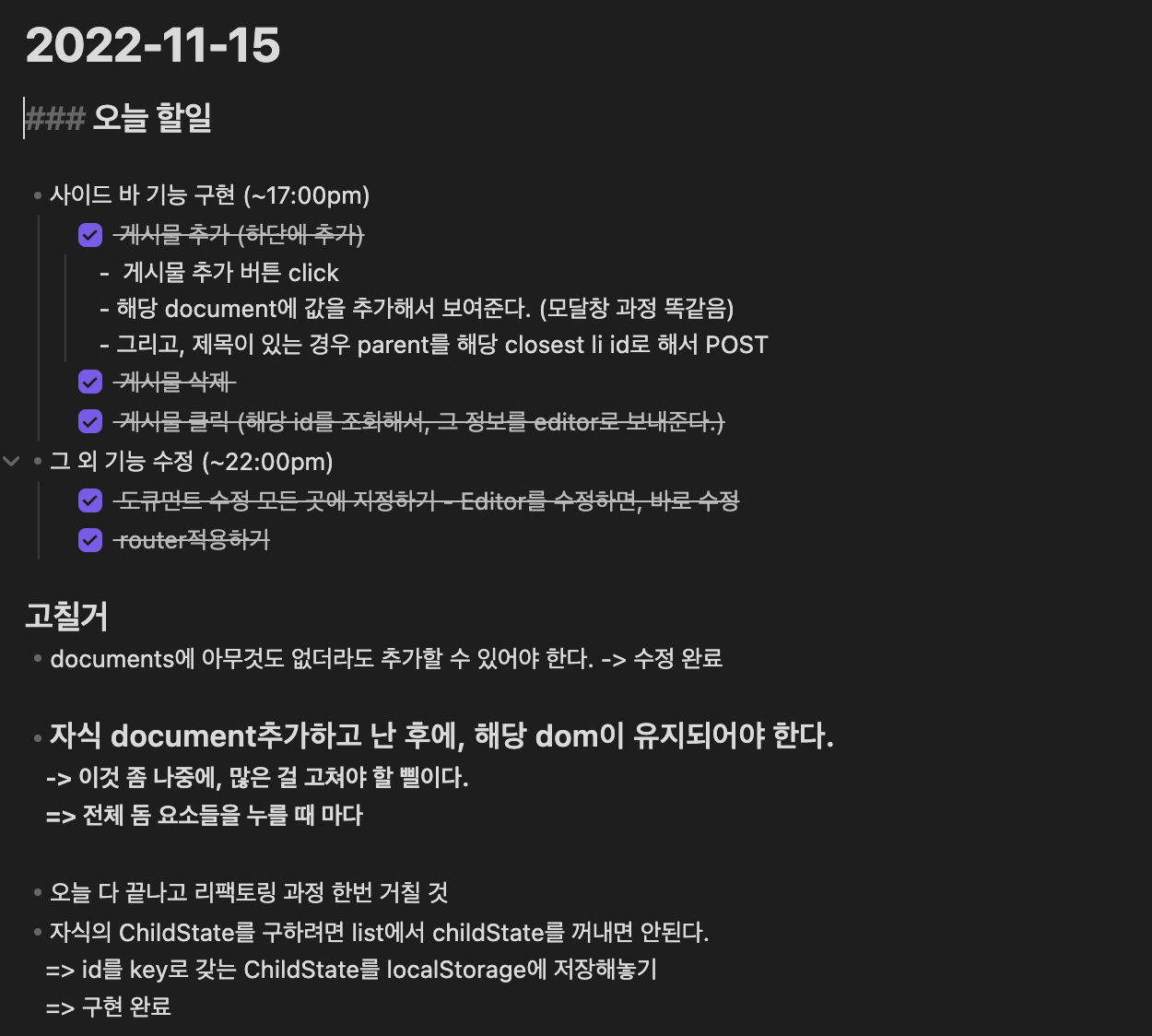 Dongtion VanllaJS로 Notion 구현해보기 개발 과정 컴포넌트를 먼저 나누어 마크업 구조를 짜봤다. - Editor, SideBar, Modal 세개의 큰 컴포넌트가 나왔다. - 먼저 마크업을 구현하고 세세한 마크업은 기능을 구현하면서 수정했다. 각 컴포넌트에 어떤 상태가 필요한지 구하고, 상태에 따른 렌더링을 구현했다. 각 컴포넌트의 기능을 구현했다. 자잘한 오류나 에러들을 고치며 리팩토링을 진행했다.