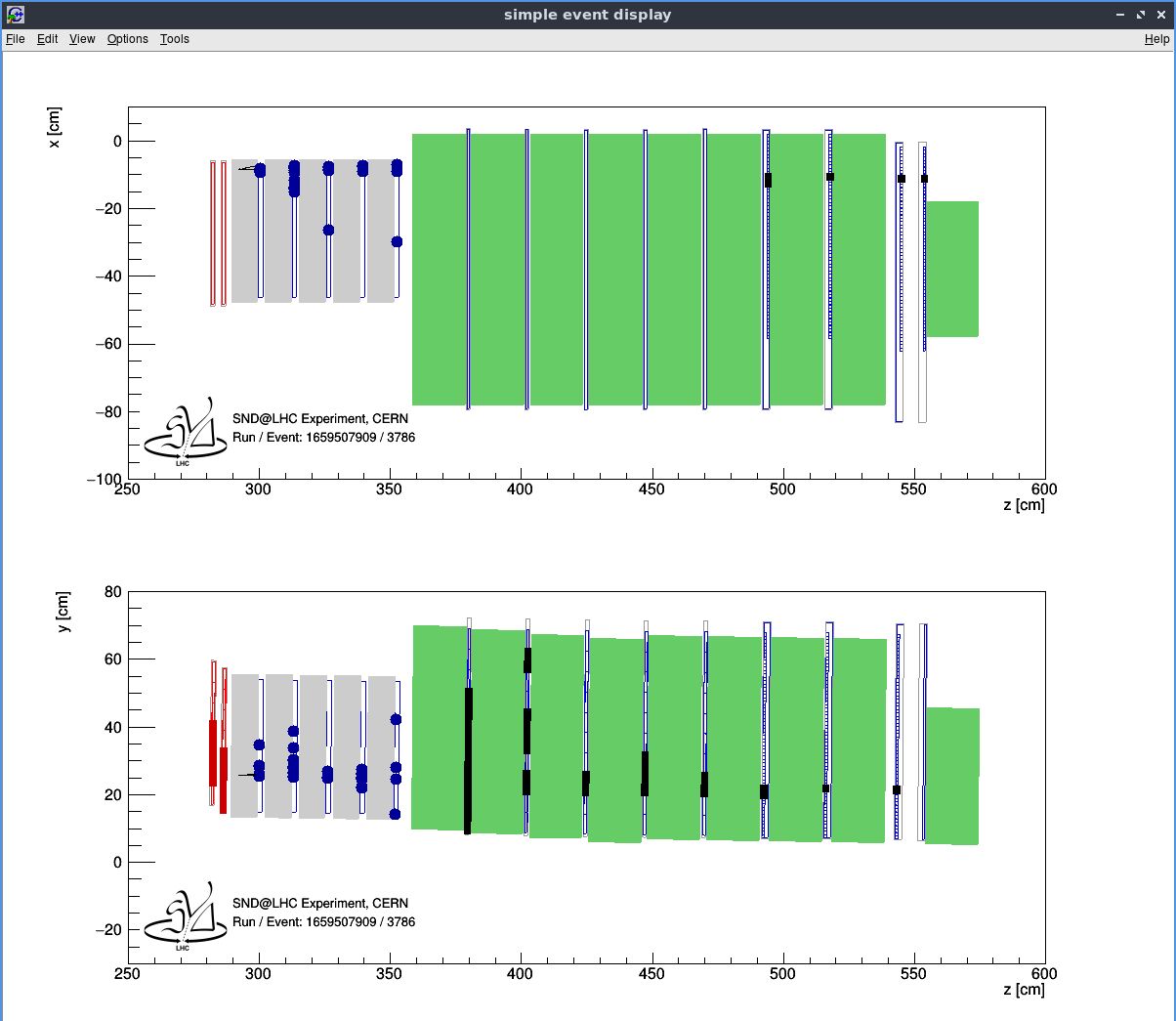 I attach here an example of a simulated muon neutrino vertex display, both in our FEDRA system and in the SNDSW system.