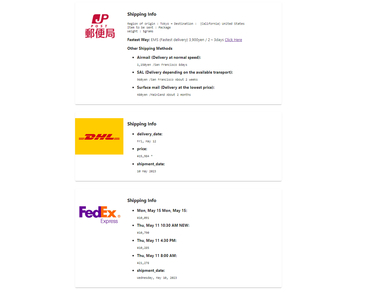 When attempting to obtain shipping prices from FedEx, USPS, UPS, and DHL, we encountered difficulties using their APIs directly. To access the APIs for FedEx, USPS, and DHL, a business API key is required, which necessitates having an actual company and applying for it. As for UPS, their API only permits quoting shipping prices from the US to Japan, rather than from Japan to the US. Consequently, we decided to utilize Selenium scripts to perform GUI interactions directly on the respective websites. Link