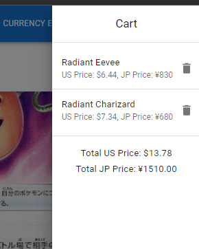 We have incorporated a cart feature that allows users to compare the total price of their selected cards in both US dollars and Japanese yen. This feature allows users to make informed decisions about their purchases by offering a clear and straightforward way to assess potential cost savings or earnings. Link