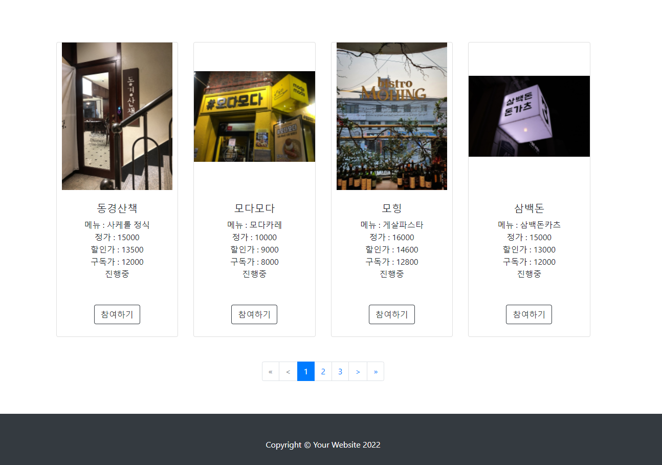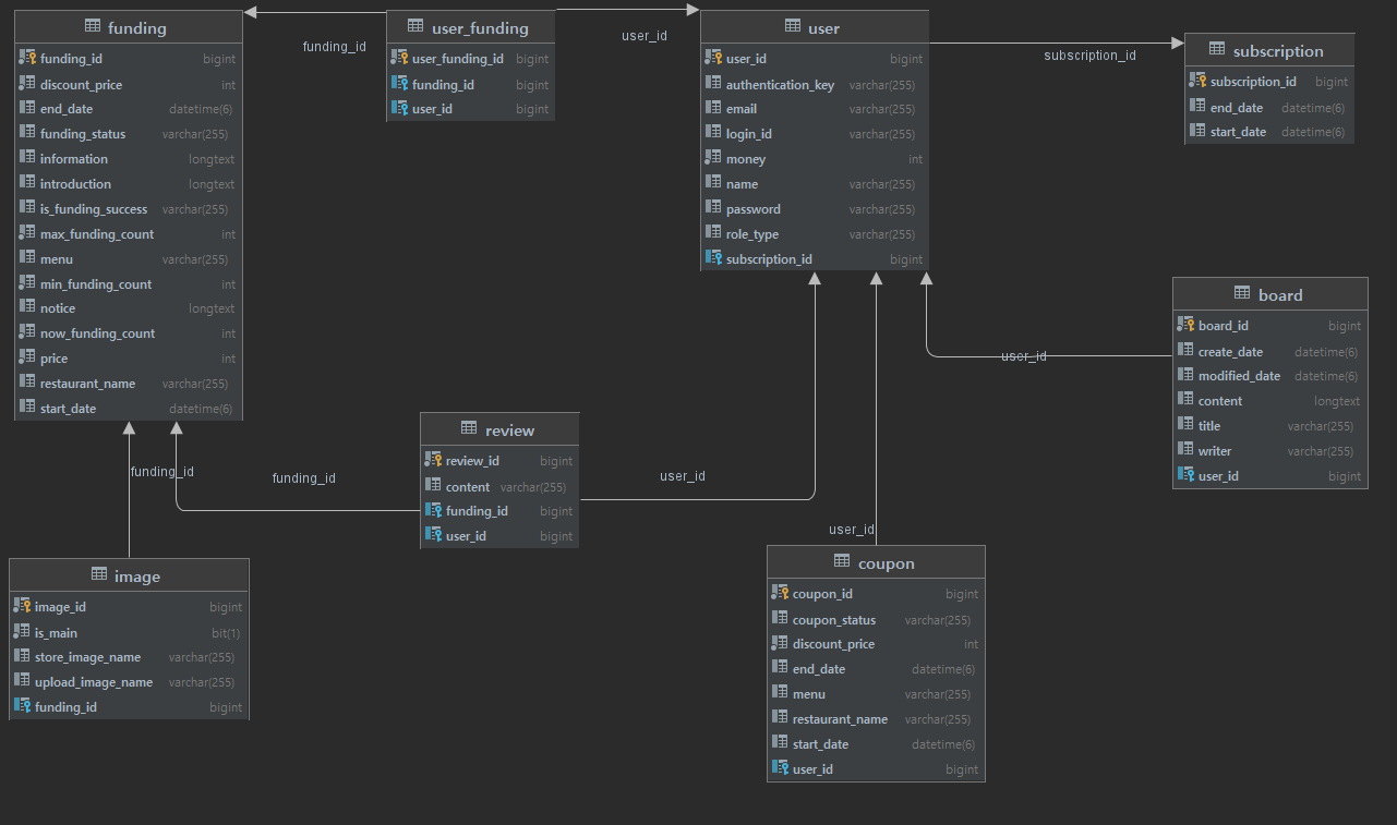 크라우드 펀딩에서 아이디어에 착안하여 매달 추가 및 삭제 그리고 갱신되는 식당 중 일정 인원수 이상의 사람들이 펀딩을 하게 되면 펀딩에 참여한 사람들에게 쿠폰이 발급되어 할인된 가격으로 식당을 이용할 수 있는 프로젝트이다.