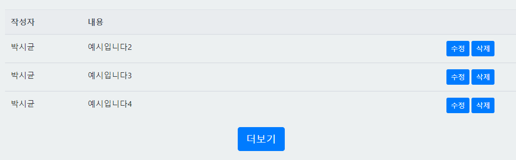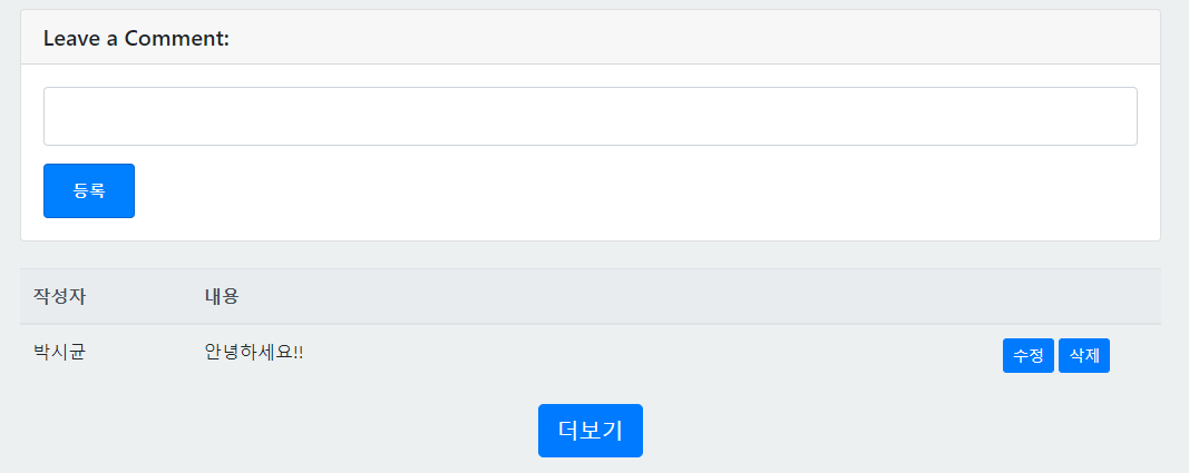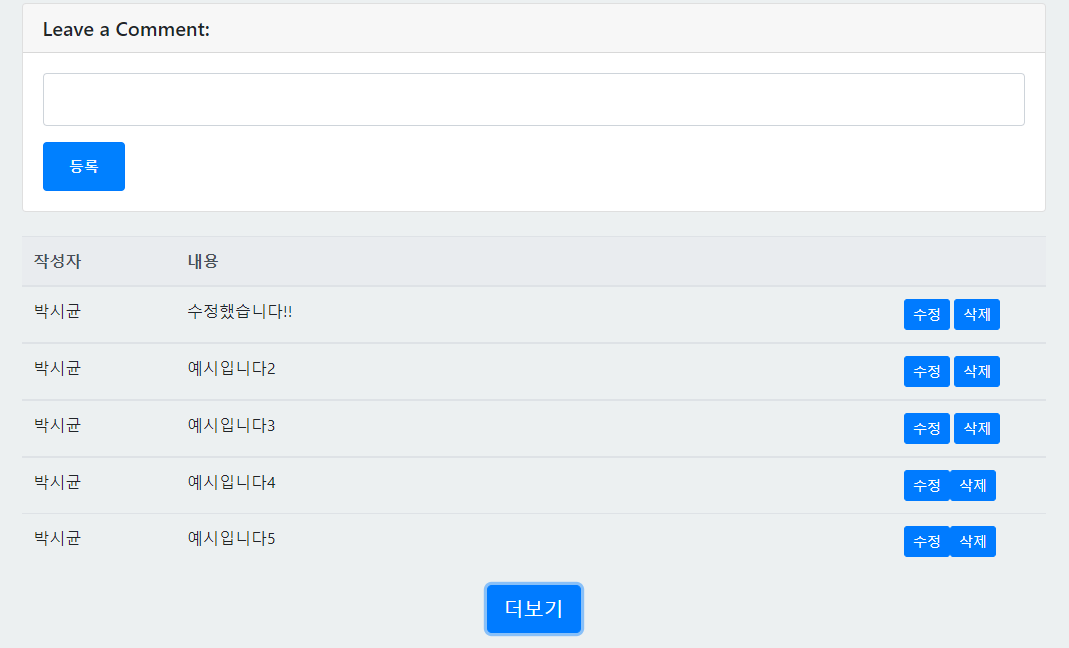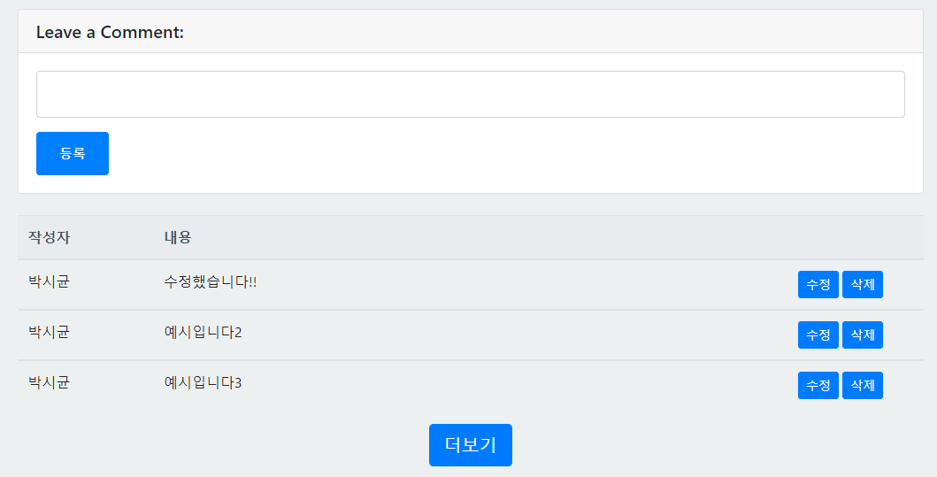 -그리고 html,css,java script 와 jquery , ajax등을 사용해 프론트부분을 만드는과정에서 데이터를 어떻게 넘겨주고 받는지 데이터를 프론트쪽에 어떤식으로 바인딩하는지 등 많은 공부가 되었다. 확실히 백엔드를 지향하지만 프론트쪽 지식이 많으면 많을수록 개발에 큰 도움이 될거같아 다음에는 React,Vue 같은 기술도 공부해서 사용해보고 싶다.