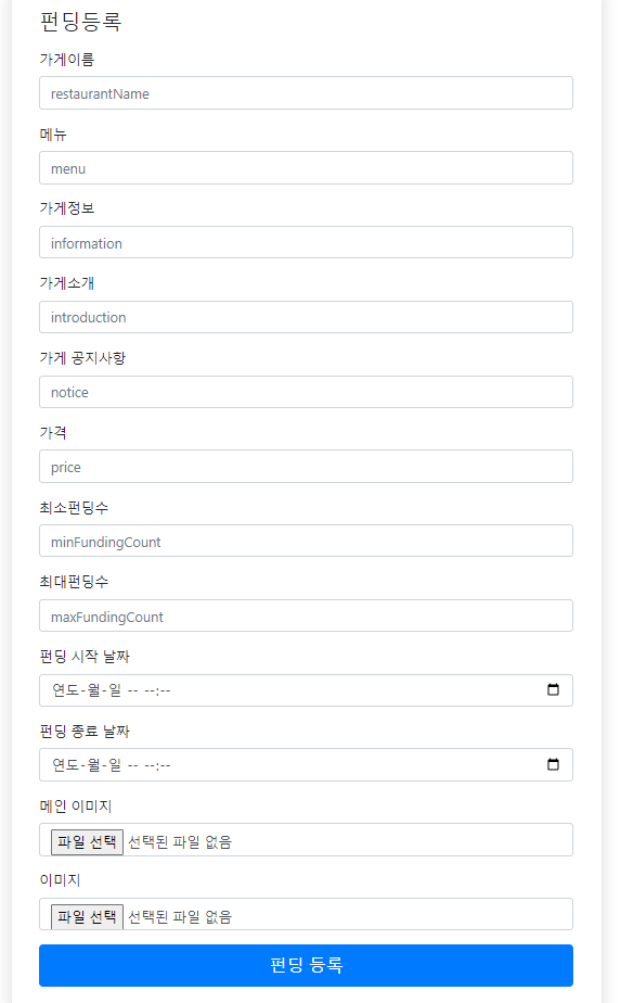 -펀딩 작성시 각종 정보와 최소,최대펀딩수,펀딩시작날짜 ,펀딩종료날짜,