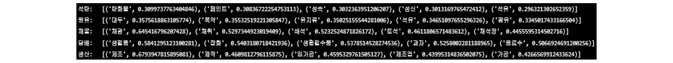 1. Text에 대해 [^가-힣 0-9 a-z A-Z]+$ -> '' 로 전처리 및 좌우 공백 전처리 2. 데이터가 존재하지 않는 산업분류코드에 대해서는 직접 수기로 데이터를 입력 3. Raw data의 NaN값에 대해서 '한국표준산업분류(10차)_국문.xlsx' 파일의 분류별 '항목명' 데이터로 대체시킴 ex) 분류코드(C, 12, 120)의 값이 NaN인 경우 -> '담배 제조업'으로 대체 4. ['을', '를', '이', '가', '은', '는', '고', '그', '의', '및','등', '외', '와','한다','하','에', '않', '안', '된'] 등의 불용어 제거 5. Raw data에 존재하는 분류코드에 대해 대분류, 중분류, 소분류 각각 '한국표준산업분류(10차)_국문.xlsx' 파일을 통해 Data Augmentation 진행 6. Mecab을 통한 형태소 분석 후 생성된 형태소를 합쳐 token list 생성7. 사전학습된 한국어 Word2vec vocab에 생성된 token을 추가한 후 word2vec 재학습(Contextual word Embedding 아님 -> Static word Embedding 수행) - Pre-trained word vector of Korean은 다음의 github에서 다운 받을 수 있음(https://github.com/Kyubyong/wordvectors) - 아래 이미지는 pretrained word2vec의 재학습을 통해 주어진 token과 높은 유사도를 가지는 token을 높은순으로 나열8. 모델 학습 시 vocab의 embedding도 같이 학습 시키기 위해 '<pad>', '<unk>' 토큰 추가 후 array화
