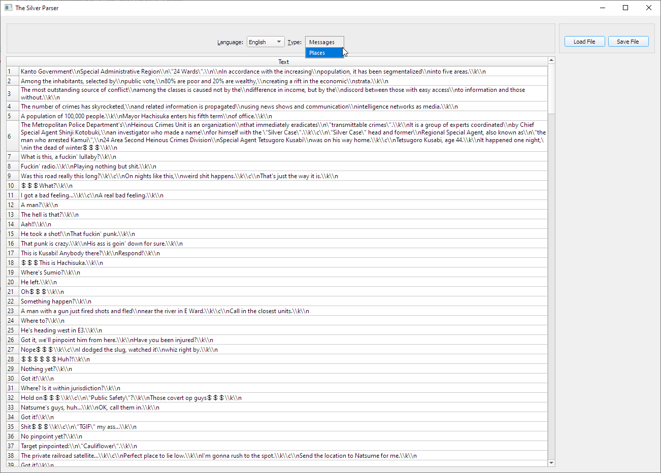 Go to the Releases tab, then download the latest .jar or .py release file. Once you have executed the file, follow the instructions and load a file to start reading/editing the game dialogs/places. The first time you load a text file, the table may take some time to fully load, so if your Table is empty after loading a file, please wait up to a minute. Also, if it's your first time using Java or Python, don't forget to add them to your OS' Path (for Java) and (for Python)